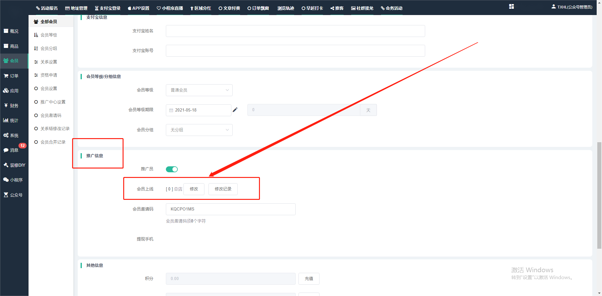 目录 搜索 展开 一、前期准备资料二、数字乡村码-上线操作指南1、服务号的申请流程及认证2、申请小程序流程3、开放平台绑定小程序和公众号三、数字乡村码-系统操作数字乡村码系统管理-概况数字乡村码-商品管理1、发布商品2、商品列表3、商品表单4、商品分类5、品牌管理6、配送模板7、评论管理8、优惠券管理9、商品标签10、退货地址设置11、满额优惠12、批量操作13、配送方式14、基础设置15、商品隐藏四、数字乡村码-会员管理1、全部会员2、会员等级3、会员分组4、资格申请5、会员设置6、推广中心设置7、会员邀请码8、会员关系链修改关系链修改记录9、会员合并记录10、账号注销管理11、会员设置中心五、数字乡村码-订单管理1、订单管理列表2、订单处理流程3、订单状态4、订单修改价格5、订单退款退货6、多包裹发货7、批量发货订单操作步骤8、催发货订单9、物流查询六、数字乡村码-财务管理1、余额设置2、会员余额3、充值记录4、转让记录5、余额明细6、收入明细7、提现设置8、提现统计9、积分管理10、转账审核11、收益广告12、批量充值七、数字乡村码-系统管理1、商城入口2、商城设置①、商城设置②、订单设置③、物流查询④、短信⑤、联系方式⑥、分类⑦、优惠券⑧、分享⑨、幻灯片⑩、广告位⑫、地图设置3、交易设置4、微信模板消息自定义消息模板(新版)自定义消息模板(旧版)小程序消息模板公众号模板消息变更公告5、语言设置6、权限管理7、多媒体管理八、数字乡村码-消息管理九、数字乡村码-应用管理十、数字乡村码系统-数据统计十一、数字乡村码-页面装修DIY1、模板管理2、店铺页面3、顶部导航4、底部导航5、DIY模板市场6、首屏广告7、基础设置8、装修DIY尺寸建议十二、供应商功能插件操作指南1、供应商2、门店-收银台门店申请和使用步骤门店管理①、门店-收银台 营销设置②、门店-收银台 分润设置门店分类门店申请门店审核门店商品门店商品订单收银台订单数据统计核销员基础设置默认设置门店装修3、微社区4、会务活动十三、营销插件操作指南活动报名提货卡新人奖微店问卷调查积分视频分享1、视频分享基础设置2、视频分享发现管理3、视频分享分类管理4、视频分享评论管理5、视频分享分红记录6、视频分享短视频中心每日红包幸运大抽奖签到优惠券二维码任务奖励优惠劵文章音频文章付费文章限时购新海报拓客卡操作流程积分活动素材中心视频红包十四、入驻门店应用类1、门店预约2、附近商品3、门店定位设置4、门店控制5、门店满额包邮6、门店满额减7、导入商品8、门店搜索9、门店股东10、核销券11、多门店核销1、商城后台设置2、前端功能演示十五、常见问题1、后台登录密码修改流程2、会员-余额,积分,后台如何进行充值与扣除3、如何修改上下级关系4、一种万能的获取商城小程序路径的方法 暂无相关搜索结果! 阅读次数:1898 本文档使用 模王系统 发布 3、如何修改上下级关系 如何修改上下级关系一.如何修改上下级关系?1.会员-全部会员-可以通过搜索用户的独立ID,或者用户微信昵称,找到此会员,然后点击右边的(操作)2.再点击会员详情。3.滑到下面,有个推广信息-会员上线,点击修改4.输入上级的ID号,点击搜索,出来此上级会员后点击选择。5.滑到最下面,一定要点击提交按钮。文档更新时间: 2024-01-05 14:50 作者:链上旅行