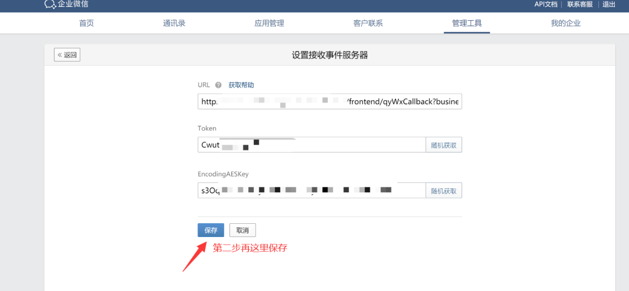 设置完成客户管理secret、客户变更通知token、客户变更通知aseKey后,请务必要先提交保存设置,在点击企业微信官方后台--客户联系中的设置接收事件服务器中的保存。