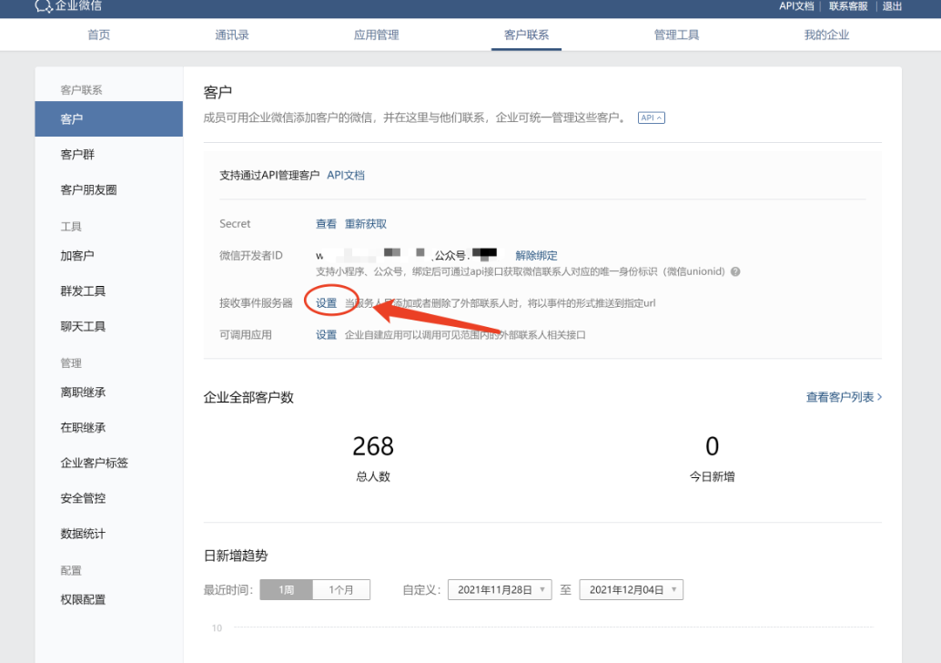 进入客户联系--客户,点击API--微信开发者ID--绑定,如下图: